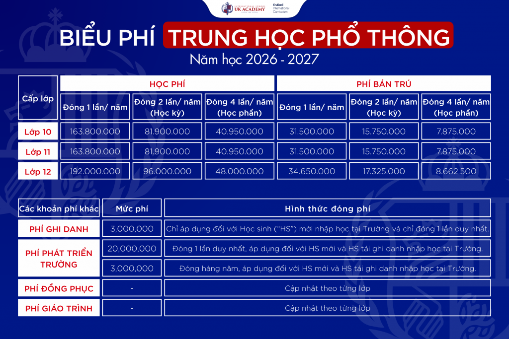 – Ngoài ra, học sinh tại UKA được tham gia nhiều kỳ thi khác theo cấp trường hoặc thi đấu giao lưu giữa các trường trong tập đoàn NHG, hoặc các kỳ thi của khu vực, đặc biệt sử dụng hoàn toàn bằng tiếng Anh.